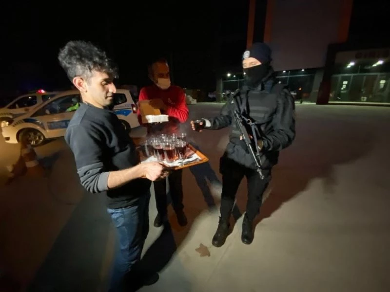 Düzce’de sokağa çıkma kısıtlaması ile birlikte saatler 21.00’i gösterdiği ilk anlardan itibaren polis ekipleri kısıtlamayı ihlal edenlere karşı cadde ve sokaklarda uygulama yaptı. D-655 karayolunda gerçekleştirilen uygulamada vatandaşların kısıtlamadan muaf olup olmadıkları denetlenirken, izinli olmayanlara ise cezai işlem uygulandı. Kısıtlamadan muaf olan bir kişi uygulamada izin belgesini göstererek yoluna devam ederken, polislere de sürpriz hazırladı. Uygulama yapılan noktaya yakın bölgedeki bir lokantayı arayan vatandaş, online sipariş vererek polislere çay söyledi.