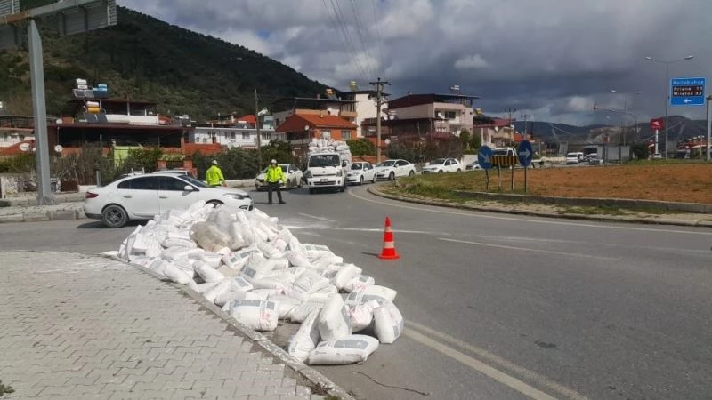 Aydın’ın Söke ilçesinde kavşaktan dönüş yapan tırın dorsesinde bulunan alçı çuvalları yola savruldu, şans eseri olay anında yolda araç bulunmaması olası bir kazayı önledi.