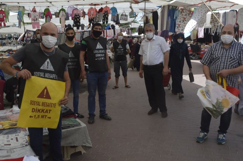 Polis ve Zabıta ekipleri pazara giren tüm vatandaşların ateşini ölçerken, 65 yaşın üzerindeki vatandaşlarla, gençlerin kimlikleri kontrol ediliyor. Kısıtlama kapsamında bulunanlar idari pazara cezasının ardından evlerine gönderiliyor. Bu arada meslek kuruluşları da sosyal mesafenin önemine vurgu yapmak adına üyelerine sloganlar içeren Küre Tekstil firmasının hazırlamış olduğu yelek ve dövizler dağıtıyor. Tuhafiyeciler Odası ile Sebzeciler Odası’nın yetkilileri tek tek tezgahları dolaşarak üyelerine bu kuralın önemini anlattı.