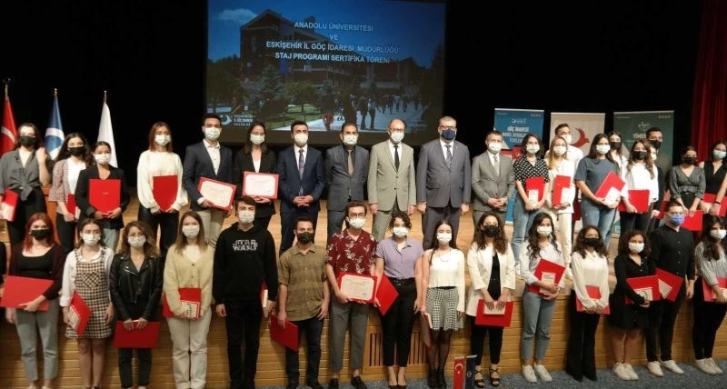 Protokol konuşmalarının ardından stajını tamamlayan öğrenciler sertifikalarını Anadolu Üniversitesi Rektörü Prof. Dr. Fuat Erdal, Eskişehir Vali Yardımcısı Akın Ağca, İçişleri Bakanlığı Göç İdaresi Genel Müdür Yardımcısı Dr. Gökçe Ok, İçişleri Bakanlığı Göç İdaresi Uyum ve İletişim Dairesi Başkanı Dr. Aydın Keskin Kadıoğlu ve Eskişehir İl Göç İdaresi Müdürü Gökhan Akyıldız’dan aldılar. Stajyerlere sertifikalarının yanı sıra bir de geçtiğimiz şubat ayında hayatını kaybeden Türk psikolog ve akademisyen Doğan Cüceloğlu’nun yayınlanan son kitabı “Var Mısın” hediye edildi.