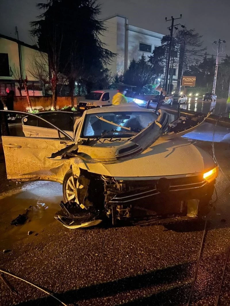 Sakarya’nın Sapanca ilçesinde su birikintisine giren lüks otomobil sürücüsünün kontrolünden çıkarak elektrik direğine çarptı. Çarpmanın etkisiyle direğin üzerine devrildiği otomobil hurdaya dönerken, sürücü kazayı hafif şekilde atlattı.