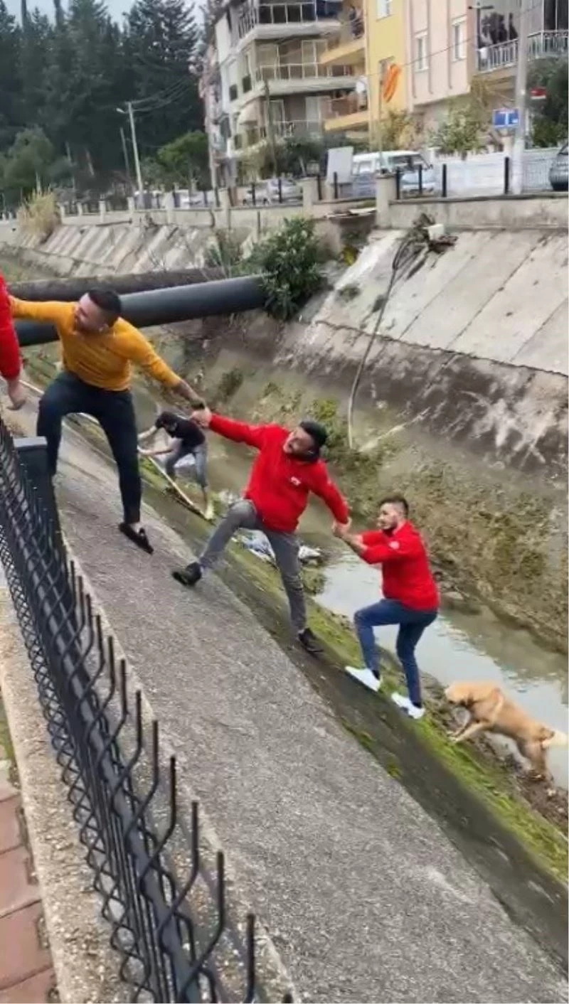 Antalya’da su kanalına düşen köpek, vatandaşlar tarafından insan zinciri oluşturularak kurtarıldı.