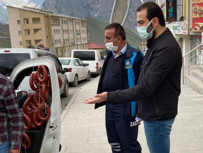 Zabıta ekibi gıda ve hijyen kurallarından uzak bir şekilde il dışında gelip Hakkari’de sucuk satışı yapan bir işportacının sucukları toplattırarak aracı ile birlikte şehir dışına sevki gerçekleştirildi. Zabıta Müdürü Adil, sokakta satılan ve menşei belli olmayan gıda mamullerine izin vermeyeceklerini belirtti. Demir, "Açıkta ve hijyenik olmayan koşullarda gıda satışına kesinlikle izin verilmeyeceğiz. Açıkta satışa sunulan gıda ürünleri halk sağlığını tehlikeye atmanın yanı sıra nerede ve nasıl üretildiği belli olmuyor. Hijyen şartını yerine getirmeyen, kayıt dışı satış yapan şahıslara itibar edilmemesi gerekiyor. Bizim için halkımızın sağlığı her şeyden önemli. Vatandaşlarımızın gerekli üretim ve satış izni alınmış, etiketi bulunan ürünleri tüketmesini istiyoruz. Ayrıca kentin değişik noktalarında korona virüs denetimlerimizi de aralıksız olarak sürdürüyoruz" dedi.