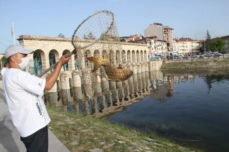 Öte yandan, çalışma esnasında beli kırılmış bir sazan balığı da kanal sularından çıkarıldı. Belinin kırık olmasına rağmen kanal sularında yaşamını sürdürmeye çalışan sazan balığı da göl sularına salındı.