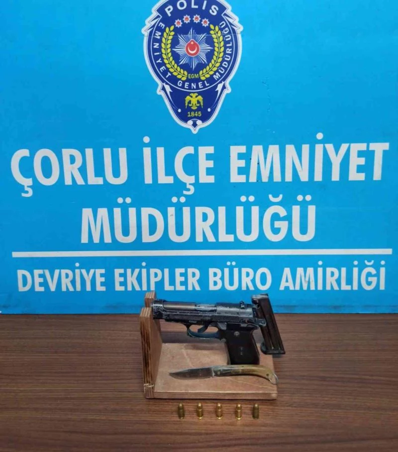Tekirdağ Çorlu’da yaya ile sürücü arasında yol vermeme nedeniyle çıkan kavgada 1 kişi bıçakla hafif yaralandı. Olaya müdahale eden Devriye Ekipler Büro Amirliği ekipleri, 2 şahsı gözaltına alırken, olayda kullanılan tabanca ile bıçak da muhafaza altına alındı.