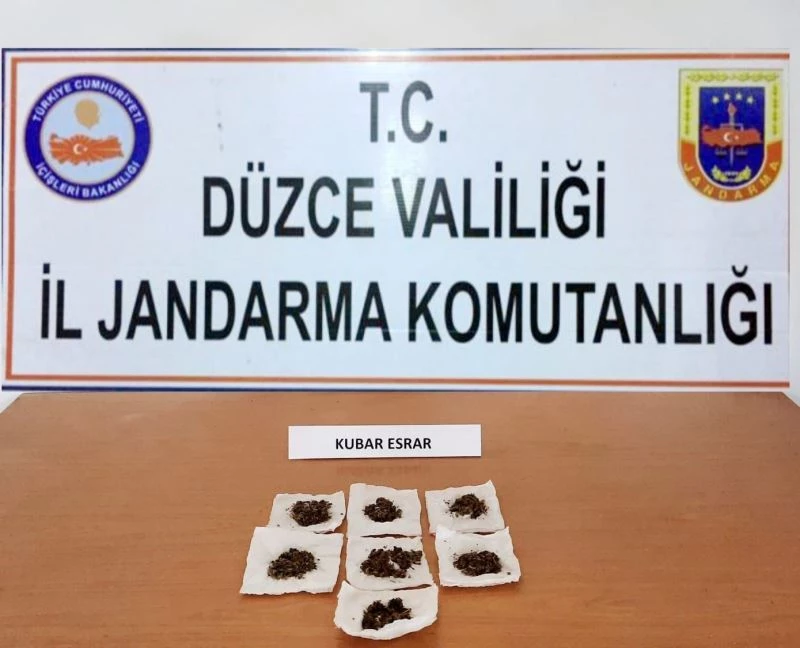 Düzce İl Jandarma Komutanlığı ekipleri Gümüşova ilçe Jandarma Komutanlığı ekipleri ile birlikte tam kapanma tedbirleri kapsamında yol uygulama noktası oluşturdu. Ekipler durdurdukları bir araçta sürücünün hareketlerinden şüphelenerek araçta arama yaptı. Yapılan aramada, arka paspas altına ve ses sistemine saklanmış Kubar esrar maddesi yakaladı. Sürücü M.Y. ve yolcu olarak bulunan K.Ü. ile R.M.’ye uyuşturucu madde kullanmaktan adli işlem yapan jandarma ekipleri ayrıca sokağa çıkma kısıtlamasını ihlal suçundan 10 bin 407 TL idari para cezası uyguladılar.
