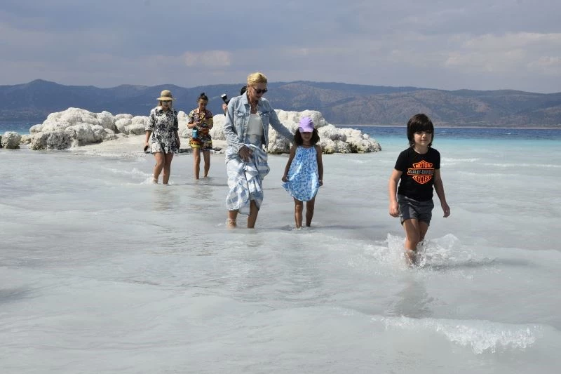 Burdur’da tam normalleşmenin ardından Salda Gölü ziyaretçi akınına uğrarken Salda Gölü Tabiat Parkı’na gelen ziyaretçiler, göl kıyısına yakın bir alanda bulunan kayaya yürüyerek geçiyorlar. Kültür ve Turizm Bakanı’nın eşi Pervin Ersoy da çocuklarıyla beraber kayalığa göl içinden yürüyerek gitti.