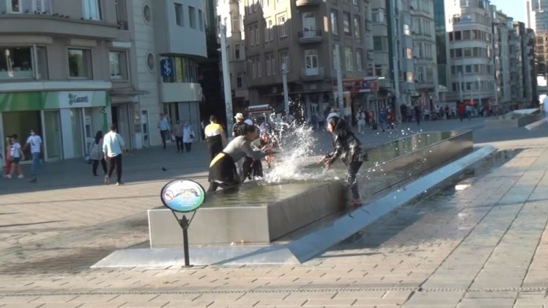 Taksim’de sıcak havadan bunalan çocuklar, meydanda bulunan havuzlara girerek serinledi. Çocukların zaman zaman havuza birbirlerini itmeleri tehlikeli anların yaşanmasına neden oldu.