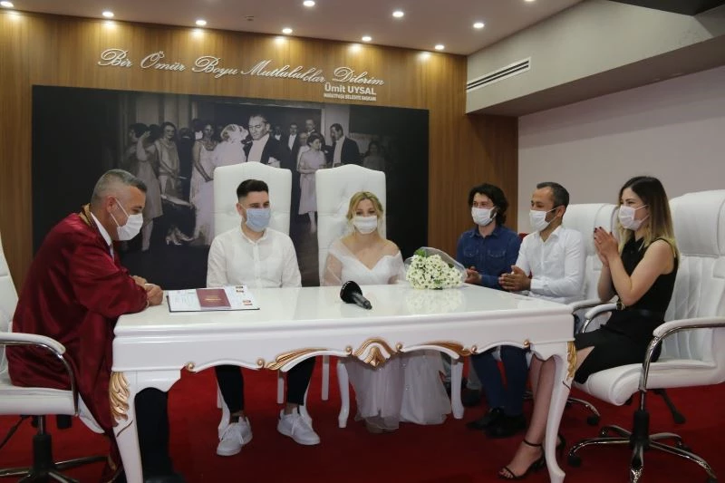Antalya’da 17 günlük tam kapanmaya girmeden önce, nikah salonlarında yoğunluk yaşandı. Önceden gün ve saatleri belirlenen çiftler, tam kapanmaya girmeden, dünya evine girdi.