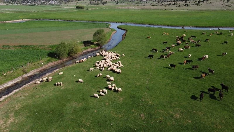 Küçük ve büyükbaş hayvancılık yapanlar tam kapanma günlerinde yayla ve meralarda, açık alanlarda, otlaklarda mesaisini devam ettiriyor. Konya’nın Beyşehir ilçesinde hayvancılığın önemli merkezlerinden olan Yeşildağ’da bahar mevsimi ile birlikte adeta kartpostallık manzaralar sergileyen meralara çıkan küçük ve büyükbaş hayvanlar, bir yandan beslenirken, diğer yandan da sulama imkanlarından yararlanıyor.