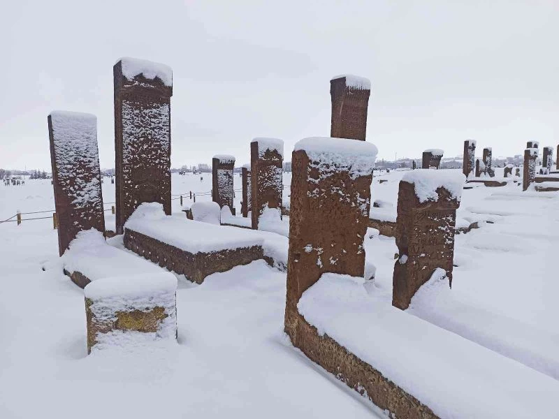 Doğu Anadolu Bölgesinde etkili olan kar yağışı hayatı olumsuz etkilerken, tarihi bir kent olan Bitlis’in Ahlat ilçesindeki Selçuklu Meydan Mezarlığı ise beyaz örtüyle kış güzelliğine büründü.