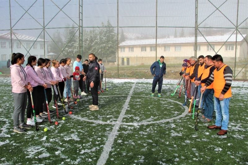 Tarlada çalıştıktan sonra Türkiye birinciliği için karda hokey oynuyorlar