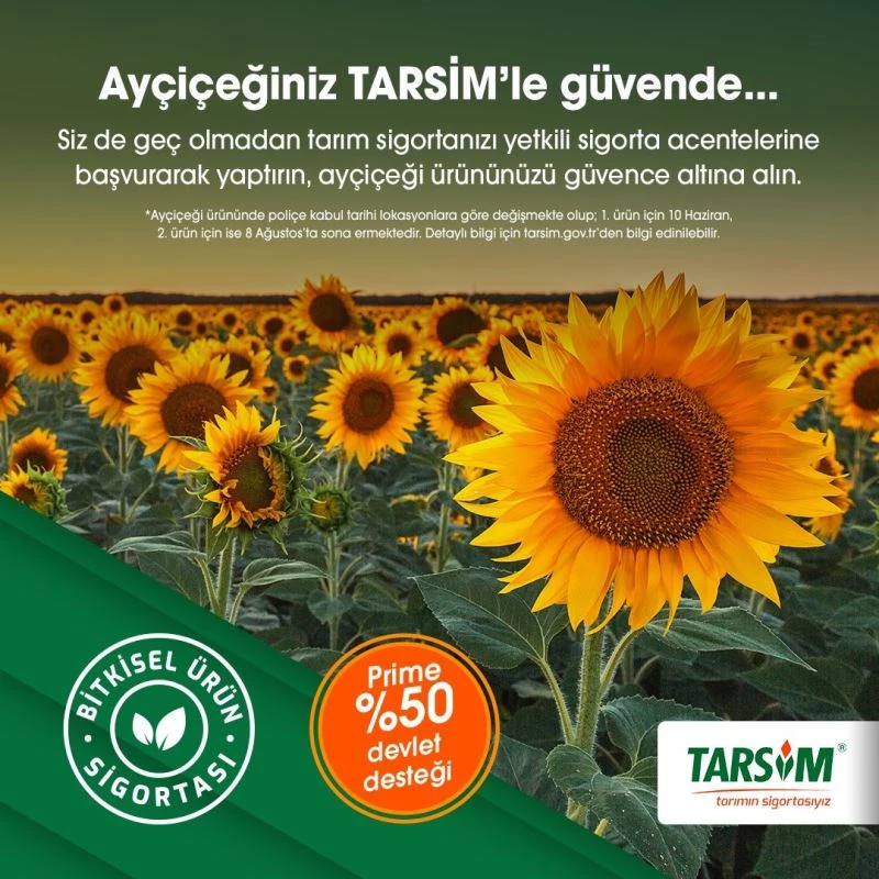 Tarım Sigortaları Havuzu’ndan (TARSİM) yapılan açıklamada, üreticilere yüzde 50 Devlet prim desteğinden faydalanmaları ve ‘ayçiçeği’ ürününü zamanında sigortalatmaları konusunda uyarıda bulunuldu. Üreticilerin ‘ayçiçeği’ ürünü için son günü beklemeden, bir an önce sigorta yaptırmalarının vurgulandığı açıklamada, öncelikle Çiftçi Kayıt Sistemi’ne (ÇKS) kayıt olunması ya da kaydın güncellenmesi gerektiği, sonrasında ise yetkili sigorta şirketlerinin acenteleri aracılığıyla tarım sigortası poliçesinin düzenlenebileceği bildirildi.