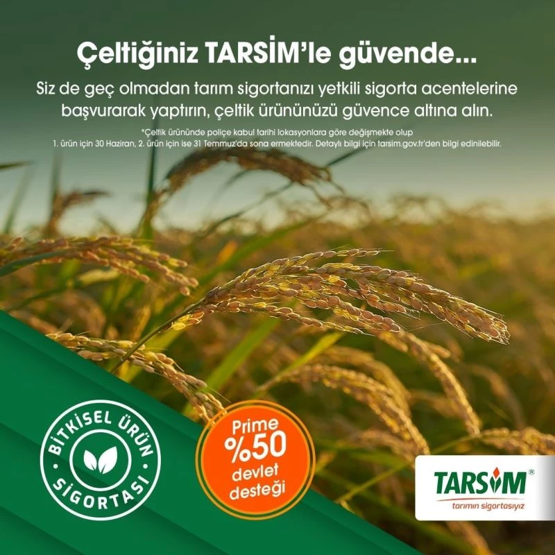 Tarım Sigortaları Havuzu’ndan (TARSİM) yapılan açıklamada, üreticilere yüzde 50 Devlet prim desteğinden faydalanmaları ve ‘çeltik’ ürününü zamanında sigortalatmaları konusunda uyarıda bulunuldu. Üreticilerin ‘çeltik’ ürünü için son günü beklemeden, bir an önce sigorta yaptırmalarının vurgulandığı açıklamada, öncelikle Çiftçi Kayıt Sistemi’ne (ÇKS) kayıt olunması ya da kaydın güncellenmesi gerektiği, sonrasında ise yetkili sigorta şirketlerinin acenteleri aracılığıyla tarım sigortası poliçesinin düzenlenebileceği bildirildi.