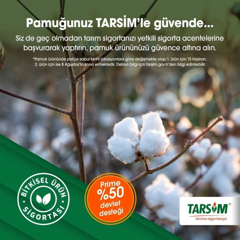 TARSİM, üreticilere yüzde 50 Devlet prim desteğinden faydalanmaları ve ‘pamuk’ ürününü zamanında sigortalatmaları konusunda uyarıda bulundu.