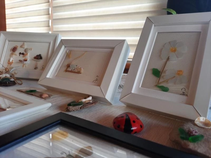 MERSİN - Mersin'in Silifke ilçesinde 68 yaşındaki Emeli Hicran Nakıpoğlu, deniz kenarından topladığı taş ve atık malzemelerle tablolar hazırlıyor.
