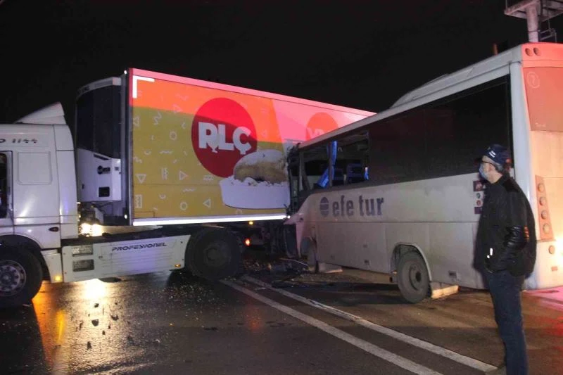 Kaza, Kocaeli’nin Başiskele ilçesi Ovacık Mahallesi Kullar Caddesi üzerinde meydana geldi. Edinilen bilgiye göre, Beypiliç firmasına ait 14 GH 359 plakalı tırın sürücüsü Y.G., dorsede bulunan tavukları boşaltmak için manevra yaptığı sırada yolu trafiğe kapattı. Bu sırada, Kullar Caddesi’nde seyir halinde olan H.S. yönetimindeki 41 P 9868 plakalı Efe Tur’a ait servis midibüsü, yolu tamamen kapatan tıra çarptı.