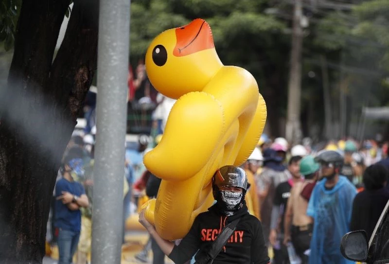 Dün erken saatlerde Parlamentonun dışında toplanan protestocuların ellerinde tuttuğu dev şişme ördekler dikkat çekti. Göstericiler, plastik ördeklerden “donanma kuvvetleri” şeklinde bahsederek polisle alay etti. Polis, göstericileri dağıtmak için defalarca kez tazyikli su sıktı ve göz yaşartıcı gaz kullandı. Protestocular da duman bombaları ve boya torbaları fırlatarak misilleme yaptı.