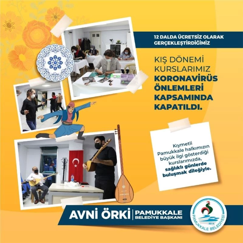 Pamukkale Belediyesi tarafından halkın büyük ilgi gösterdiği ve 12 dalda açılan kış dönemi kursları kapatıldı. Cumhurbaşkanı Recep Tayyip Erdoğan tarafından önceki gün açıklanan korona virüs önlemleri kapsamında Pamukkale Belediyesi tarafından korona virüs önlemleri alınarak açılan halk oyunları, bağlama, seramik porselen çiçek yapımı, kadınlar el sanatları, biçki dikiş ve iğne oyası, yabancı dil, işaret dili, diksiyon, ahşap boyama ve ebru çalışmaları durduruldu. Pamukkale Belediye Başkanı Avni Örki, vatandaşların büyük ilgi gösterdiği kış dönemi kurslarının korona virüs tedbirleri çerçevesinde kapatıldığını belirterek, “Dünyayı etkisi altına alan korona virüs pandemisi maalesef giderek yayılıyor. Halkımızın büyük ilgi gösterdiği kurslarımızda biz gereken tedbirleri alarak çalışmaları yapıyorduk. Ancak korona virüsle mücadele için yayınlanan son genelgeyle birlikte vatandaşlarımızın sağlığını da düşünerek kurslarımızı kapatmak zorunda kaldık” diye konuştu.