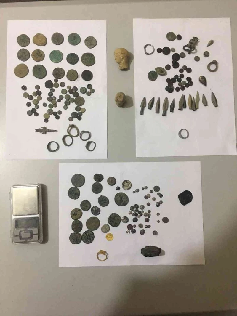 Tekirdağ İl Emniyet Müdürlüğüne bağlı polis ekiplerince, tarihi eser kaçakçılığının önlenmesi ve deşifre edilmesine yönelik çalışmalar yapılıyor. Yapılan çalışmalarda, Tekirdağ’ın Hayrabolu ilçesinde durdurulan bir araçta arama yapıldı. Aramalarda, 1 adet hassas terazi, 165 adet bronz sikke, 1 adet 1,40 gram ağırlığında altın sikke, 8 adet bronz yüzük, 1 adet altın yüzük (4,49 gram), 13 adet ok ucu, 5 adet broş, kolye ucu ve minyatür lahit, 2 adet heykelcik olmak üzere tarihi eser niteliğinde olduğu değerlendirilen toplam 195 adet eser ele geçirildi.
