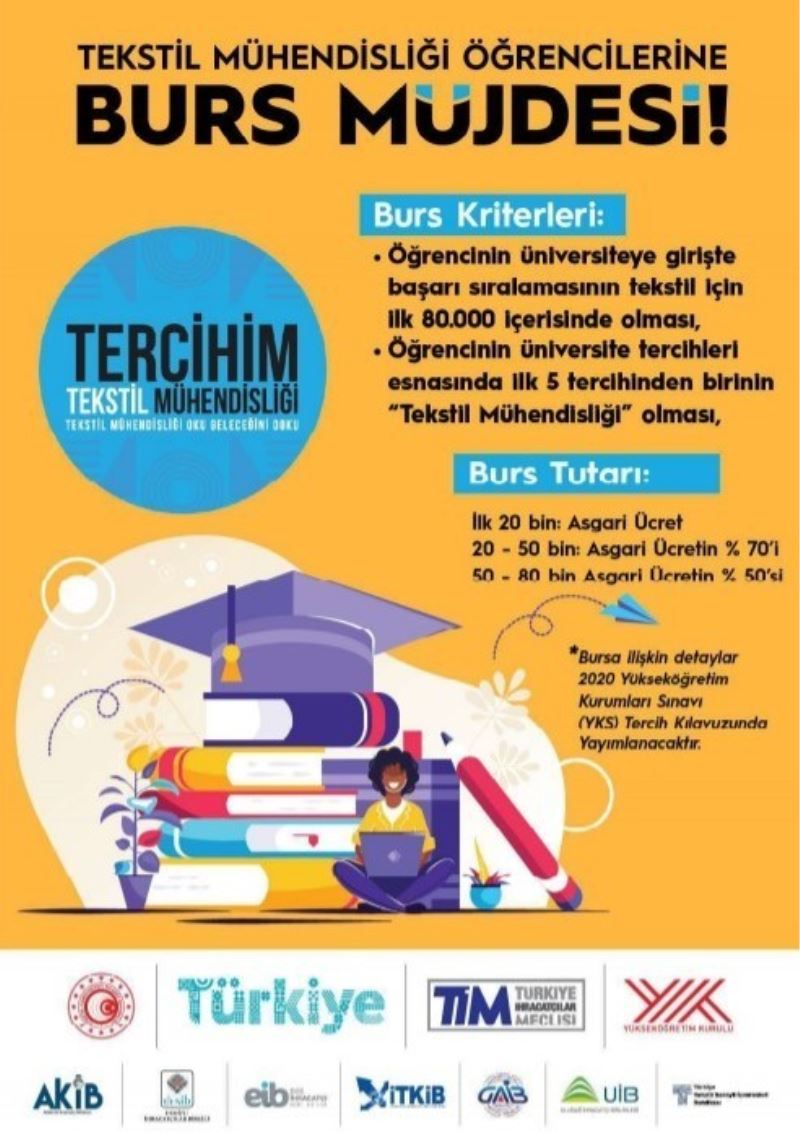 Ticaret Bakanlığı öncülüğünde Türkiye İhracatçılar Meclisi (TİM), Türkiye genelindeki 10 ihracatçı birliği ve Türkiye Tekstil Sanayi İşverenleri Sendikası’nın (TTSİS) Yükseköğretim Kurulu (YÖK) arasında imzalanan protokole göre, üniversite sınavında ilk 20 bine giren öğrenciler, tekstil mühendisliğini tercih etmesi halinde her ay net asgari ücret tutarında karşılıksız burs alacak.