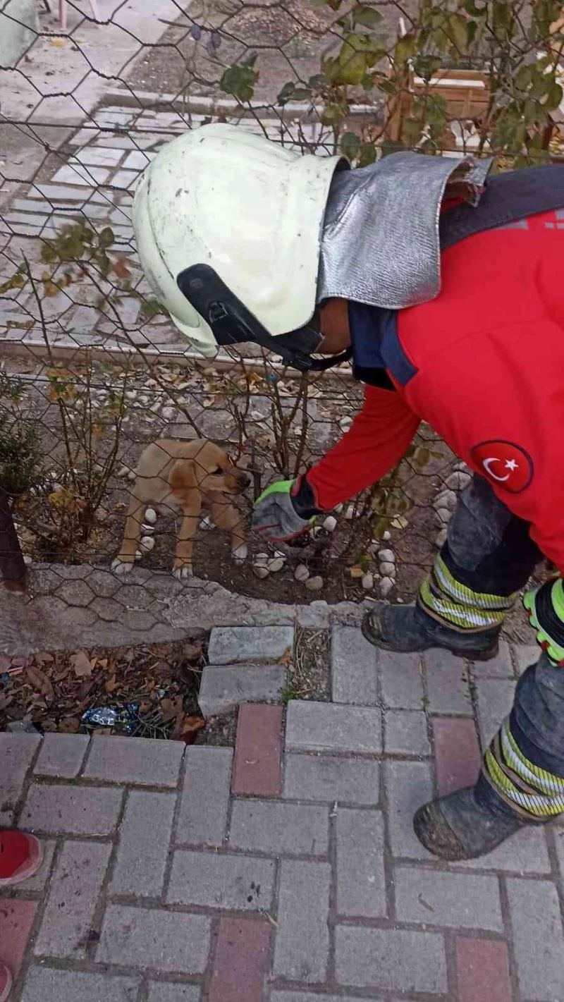 Tel örgüsüne başı sıkışan yavru köpeği itfaiye kurtardı