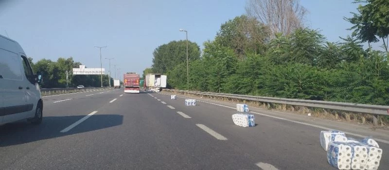 TEM Otoyolu’nda kapağı açılan tırdan kağıt peçeteler yola saçıldı