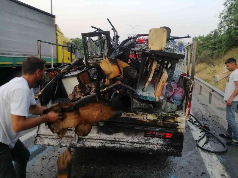 TEM’de araç yangını: Kamyonetteki ahşap malzemeler küle döndü