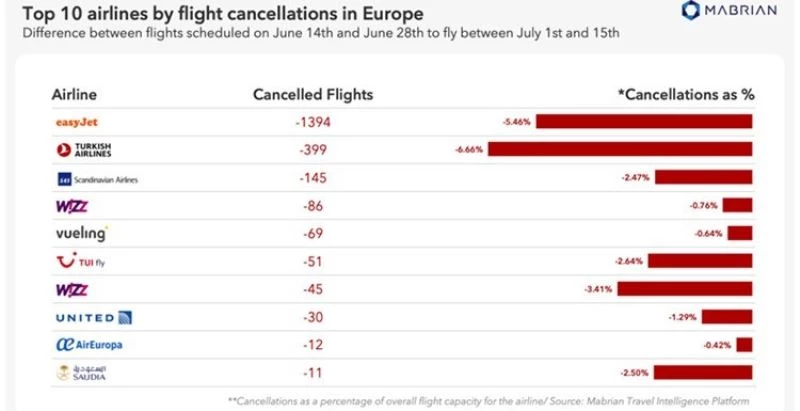 Yaz sezonunun başlamasının ardından yolcu sayılarının artması uçuşlarda gecikme ve iptallere sebep oluyor. Seyahat bilgi platformu Mabrian, Avrupa’da en fazla uçuş iptali gerçekleştiren 10 hava yolunu açıkladı. THY uçuş sayısı açısından listede ikinci sırada yer alırken, uçuş sayısı oranında ise en fazla iptal yaşayan havayolu oldu. 14 Haziran-28 Haziran arasında planlanan Temmuz’un 1’i ile 15 arasında uçulması planlanan ancak iptal olan sefer sayılarını paylaştı. Buna göre en fazla sefer iptali yaşayan havayolu 1394 uçuşla easyJet, ikinci 399 seferle Türk Hava Yolları (THY), üçüncü 145 sefer ile Scandinavian Airlines oldu. Uçuş sayısına oranla en fazla uçuş iptal eden havayolu ise yüzde 6,66 oranla THY oldu. easyJet, 5,46 oranla ikinci, 3,41 oranla Wizz ise üçüncü oldu.