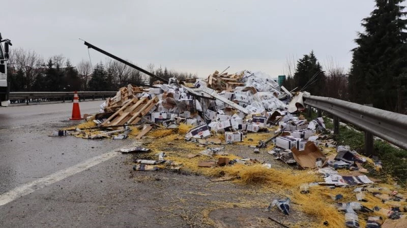 Kocaeli’de karayollarının temizlik aracına çarpan tır yola devrilince dorsede yüklü tonlarca bakliyat yola saçıldı. Kazada yaralanan tır sürücüsü hastaneye kaldırıldı.
