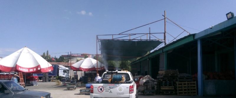 Kırıkkale Belediyesi Temizlik İşleri Müdürlüğüne bağlı ilaçlama ekipleri, haftalık tonlarca meyve ve sebzenin giriş yaptığı Toptancı Halinde düzenli olarak dezenfeksiyon ve ilaçlama yapıyor.