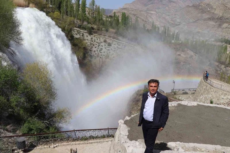 Tortum Gölü’nün doluluk oranının yüzde yüz kapasiteye ulaşması, Tortum Şelalesi’nde su debisini de yükseltti. Şelalede suyun düştüğü noktadan itibaren oluşan gökkuşağı adeta görsel şölen oluşturdu.