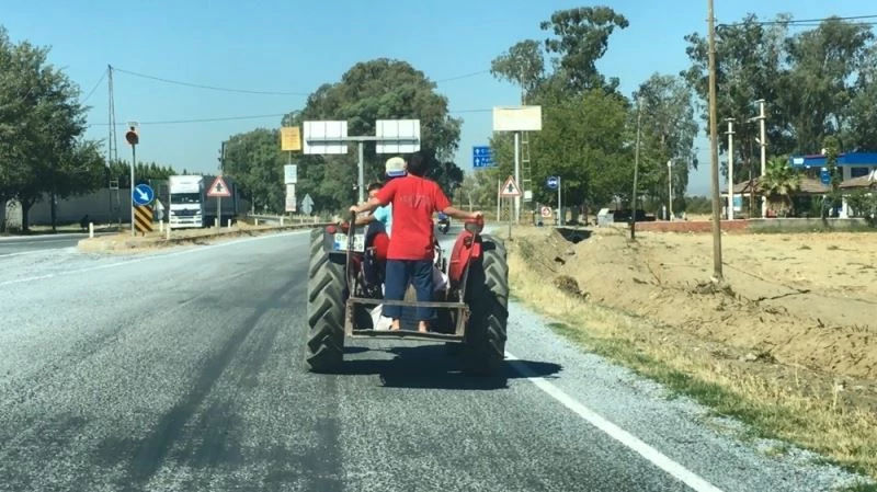 Aydın’ın Efeler ilçesi kırsal Dalama Mahallesi’nde traktörün arkasındaki demir kasada tehlikeye aldırış etmeden ayakta yolculuk yapan iki çocuğu görenlerin yüreklerini ağızlarına getirirken, ölümle burun buruna yapılan yolculuk vatandaşlar tarafından kaydedildi.
