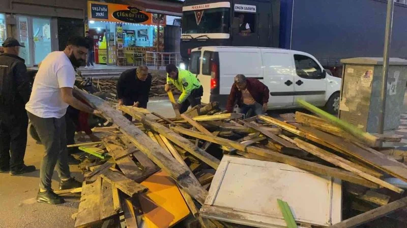 Traktörün römorku devrildi, yola saçılan tahtaları polis ve vatandaş böyle topladı