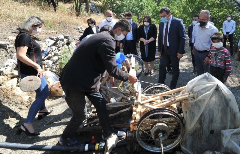 Mandal, İl Milli Eğitim Müdürü Pervin Töre ve beraberindekiler ile genç kaşif Ramazan Kargılı’nın evinin bahçesinde bir su kaynağı önünde kurmuş olduğu ve tamamen kendi ürettiği elektriği kullanarak çalıştırdığı biber doğrama makinesi, yoğurt dövme makinesi (yayık), matkap, yoğurt kovasından elektrik süpürgesi aletlerini inceledi.