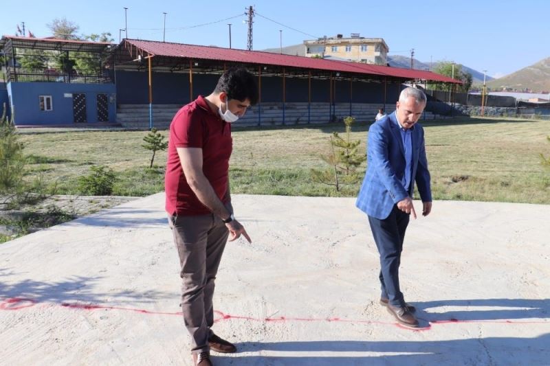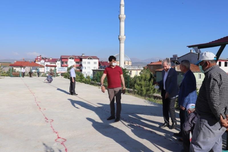 Tufanbeyli ilçesindeki namaz kılınacak cami ve bahçelerinde dezenfektan işlemi yapılırken, güreş sahasında kılınacak cuma namazı öncesi sosyal mesafe kurallarına uyulması için sprey boya ile namaza durulacak yerleri belirledi.