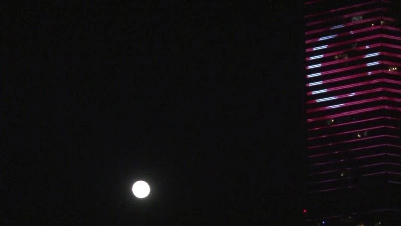Bir binadan yansıtılan Türk bayrağı ve dolunayın akşam saatlerinde kaydedilen etkileyici anları görenleri adeta büyüledi. Dolunay ve Türk bayrağının bir arada olduğu o anlar doyulmaz bir manzara sundu.