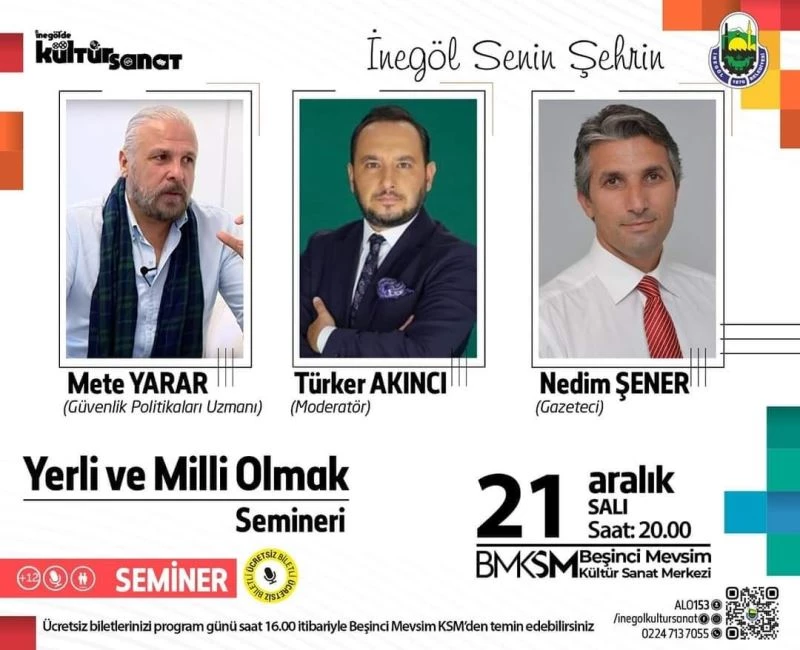 Beşinci Mevsim Kültür Merkezi, 21 Aralık Salı akşamı 3 önemli konuğu ağırlayacak. İnegöl Belediyesi, son dönemde ülke gündemini oluşturan ekonomi başlığı başta olmak üzere devletin iç ve dış politikalarının ele alınacağı “Yerli ve Millî Olmak” konulu seminer tertip ediyor. Türker Akıncı’nın yöneteceği programda, güvenlik politikaları uzmanı Mete Yarar ve gazeteci Nedim Şener güncel meseleleri anlatacak.