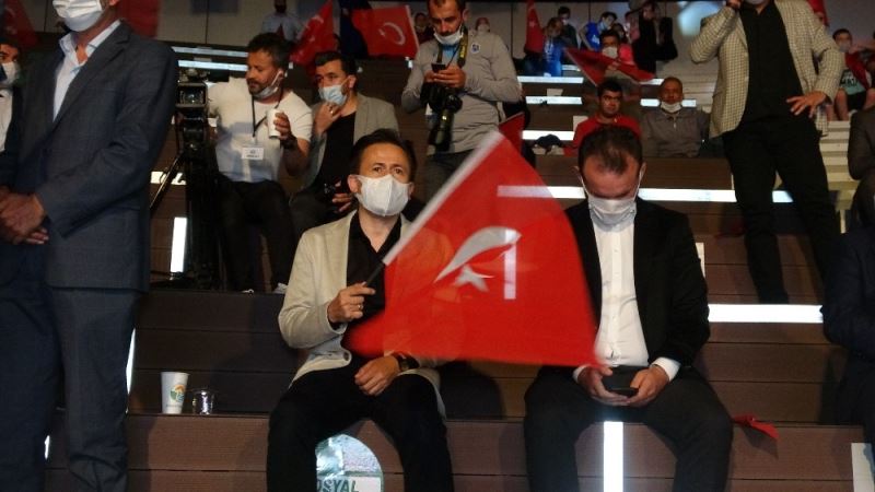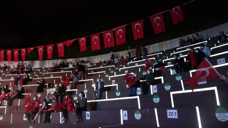 Programda seyirci koltuklarının başından sonuna kadar uzanan dev Türk bayrağı açıldı. Vatandaşların el birliğiyle dalgalandırılan dev Türk bayrağı drone ile havadan görüntülendi.
