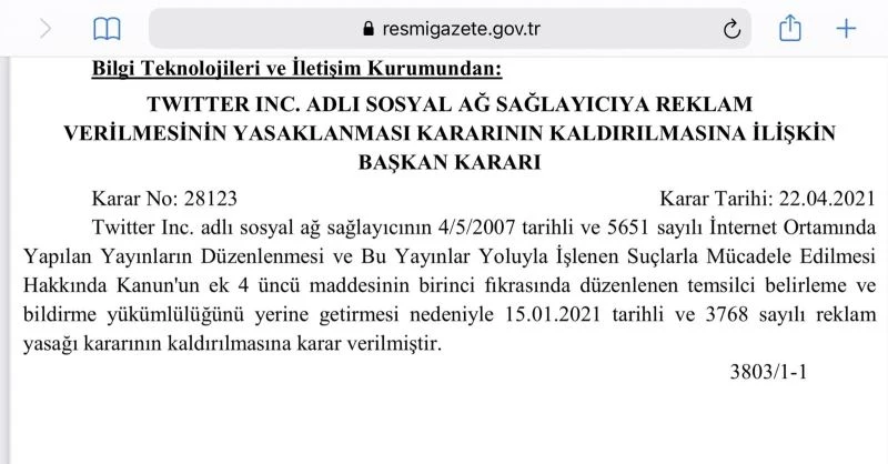 Twitter’a uygulanan reklam yasağı bugün Resmi Gazete’de yayımlanan kararla kaldırıldı