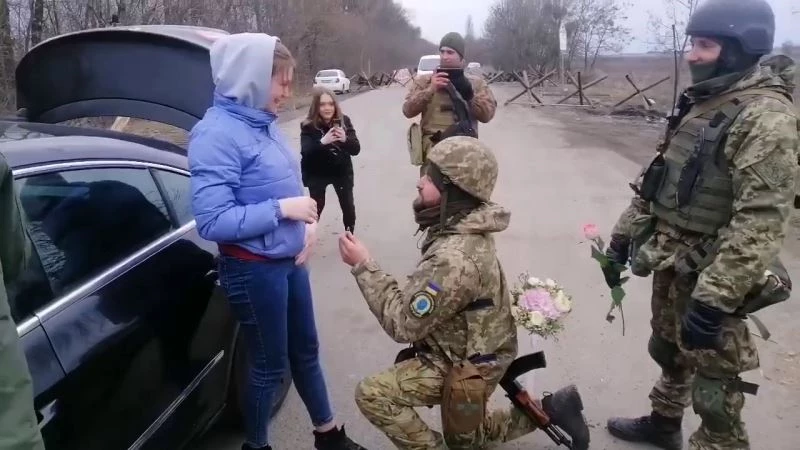 Ukrayna’da bir asker, kontrol noktasında sevgilisinin bulunduğu aracı arama yapmak için durdurmasının ardından dizlerinin üstüne çökerek evlilik teklifinde bulundu.
