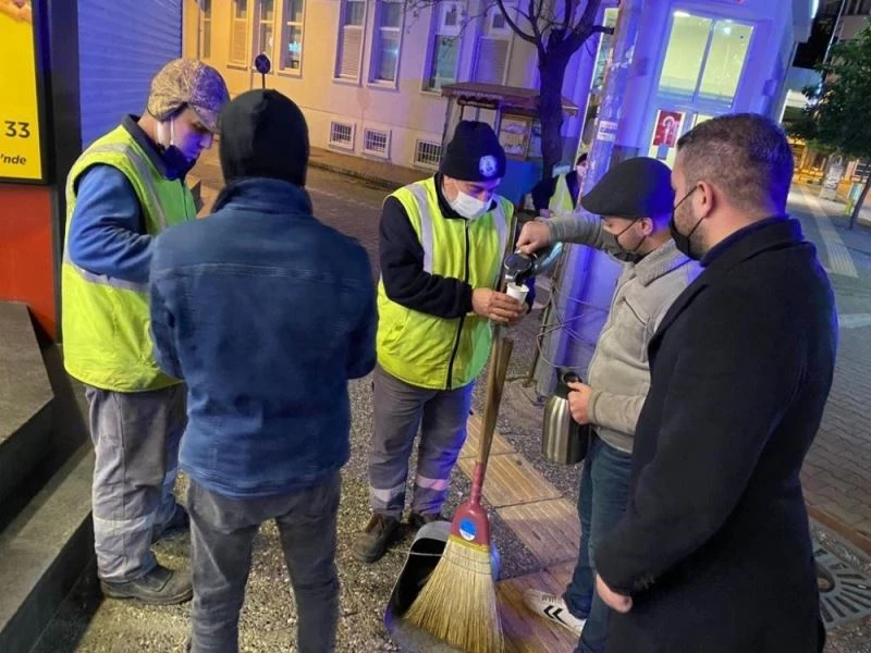 Gece sıcaklığının eksi 3 dereceye kadar düştüğü Edremit ilçesinde gece boyunca pandemi nedeniyle uygulanan sokağa çıkma yasaklarında sokaklarda çalışmak zorunda kalan polis, bekçi ve belediye temizlik işçilerini unutmayan Edremit Ülkü Ocaklarındaki Ülkücü gençler sıcak çay ve kek ikramına bulundular.