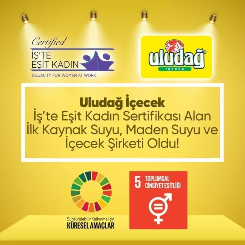 İş hayatında kadınlara eşit haklar ve fırsatlar verilmesi için çalışan kurumların çalışmalarının sertifikalandırılması ve küçük ve orta ölçekli işletmelerden başlayarak adil toplum oluşturma hedeflerinin yayılması hedefleyen Uludağ İçecek, Global Compact Türkiye Kadının Güçlenmesi Pensipleri (WEPs) ile örtüşen Kadına Eşitlik Prensipleri çerçevesinde belirlenen kriterlerin denetlendiği ve Sürdürülebilirlik Akademisi tarafından oluşturulan programa yaptığı başvuru sonucu 100’den fazla ülkede denetimler gerçekleştiren İntertek tarafından İş’te Eşit Kadın Sertifikası’nı sektöründe ilk ve öncü firma olarak almaya hak kazandı. Denetimler kapsamında Uludağ İçecek, yönetim sistemi, işe alım ve çalıştırma, iş sağlığı ve güvenliği, tedarik zinciri, sosyal etki gibi konu başlıkları cinsiyet eşitliğine yönelik şirket politikaları, kadın istihdamına yönelik ölçülebilir hedefleri, kadın çalışan sayıları, çalışanlar ve yöneticiler arasında cinsiyet bazında dağılım dengesi, işe alım ve değerlendirme süreçlerinde cinsiyet eşitliği, aynı işi yapan kadın ve erkek çalışanların ücret dengesi açısından değerlendirdi. Uludağ İçecek, bu değerlendirmeler sonucunda çalışanlar için tercih edilen şirket olarak görülmenin yanı sıra herkesin yaşamak istediği adil toplum düzeni oluşturmaya da destek olan kurumlardan biri olmanın gururunu yaşıyor.