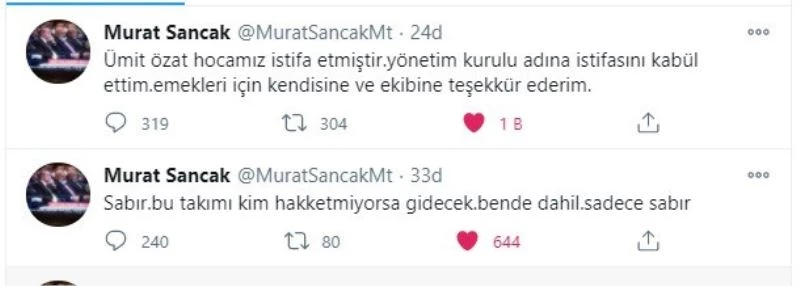 Öte yandan ilk açıklamadan 10 dakika sonra ise Başkan Murat Sancak, “Sabır. Bu takımı kim hak etmiyorsa gidecek. Bende dahil. Sadece sabır” tweetini attı.