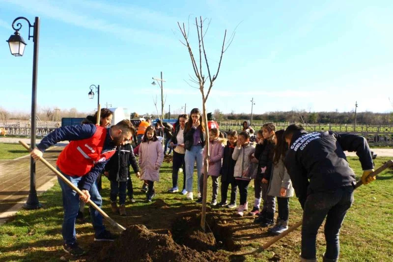 Üniversite öğrencileri, miniklerle birlikte fidan dikti