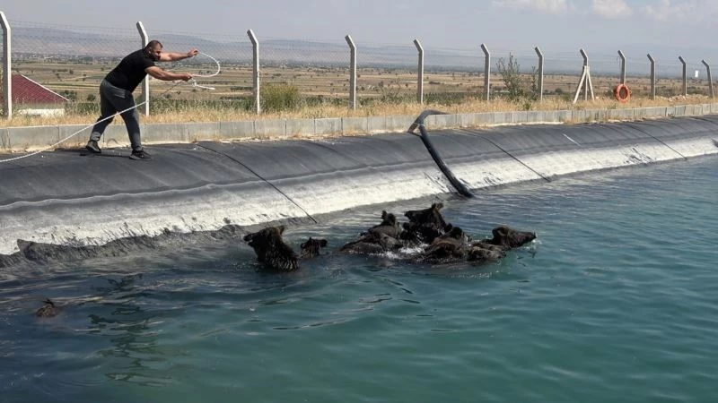 Ünlü domuz avcısı, kanala düşen yaban domuzlarını kurtardı