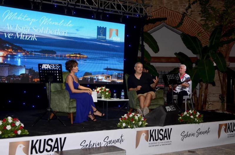 Kuşadası Belediyesi ile Kuşadası Altın Güvercin Kültür Sanat ve Tanıtım Vakfı’nın (KUSAV) ortaklaşa düzenlediği ’Ay Işığı Sohbetleri ve Müzik’ isimli programın bu haftaki konuğu ünlü tiyatro sanatçısı Levent Üzümcü oldu. Mehtap Meral’in şarkılarıyla renk kattığı gecede Üzümcü, insanlık tarihi boyunca sanatın gelişimini ve önemini izleyicilere anlattı.
