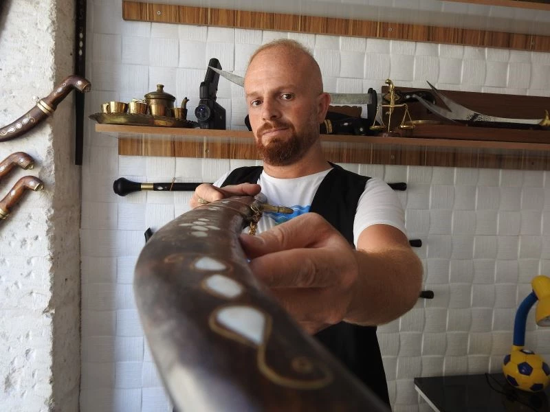 İhracata başlama hikayesini anlatan Korhan, “Bir gün yabancı bir ülkeye ait bir numaradan beni aradılar. Arayan kişi bizi Katar’dan aradığını ve ürün almak istediğini söyledi ancak biz ciddiye almadık. Bizi nereden buldu? Bizi dolandırmaya mı çalışıyor diye düşünüyorduk. Sonra arayan kişinin ısrarı nedeniyle baktık ki gerçekten bizden ürün almak istiyor. Biz de maliyeti söyledik, hesap numaramızı verdik ama hala ciddiye almıyorduk bu kadar parayı gönderebileceğini de düşünmüyorduk. Kısa bir süre sonra paranın hesabımıza yattığını gördük ve hemen ürünlerini yolladık. Bu olayın ardından başta Ortadoğu ülkeleri olmak üzere Arap ülkelerine ihracat serüvenimiz başladı. Şuanda bu ülkelere sedef-kakma sanatıyla üretilmiş olan kılıç, kama, baston ve bıçaklı baston gibi ürünleri ihraç ediyoruz. Hedefimiz sedef-kakma sanatımızı bütün dünyaya tanıtmak. Fiyatlarımız 175 TL’den başlayıp 5 bin TL’ye kadar çıkıyor. Üründeki fiyatı işlemesi ve el emeği belirliyor bu nedenle de ürünler arasında fiyat farkları oluşuyor” diye konuştu.