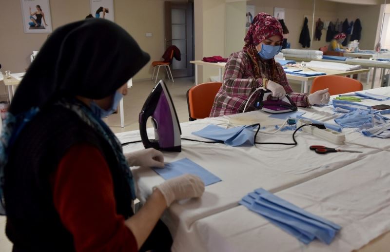 Kadınlar tarafından özen ile hazırlanan maskeler, pamuklu kumaştan üretiliyor ve yıkanarak yeniden kullanılabiliyor.