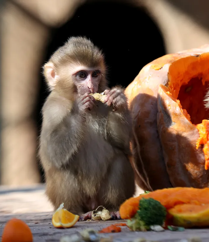 Sebze ve kuru yemiş ile beslenen maymun yavrusuna dengeli olarak da zaman zaman çok sevdiği için portakal da veriliyor.